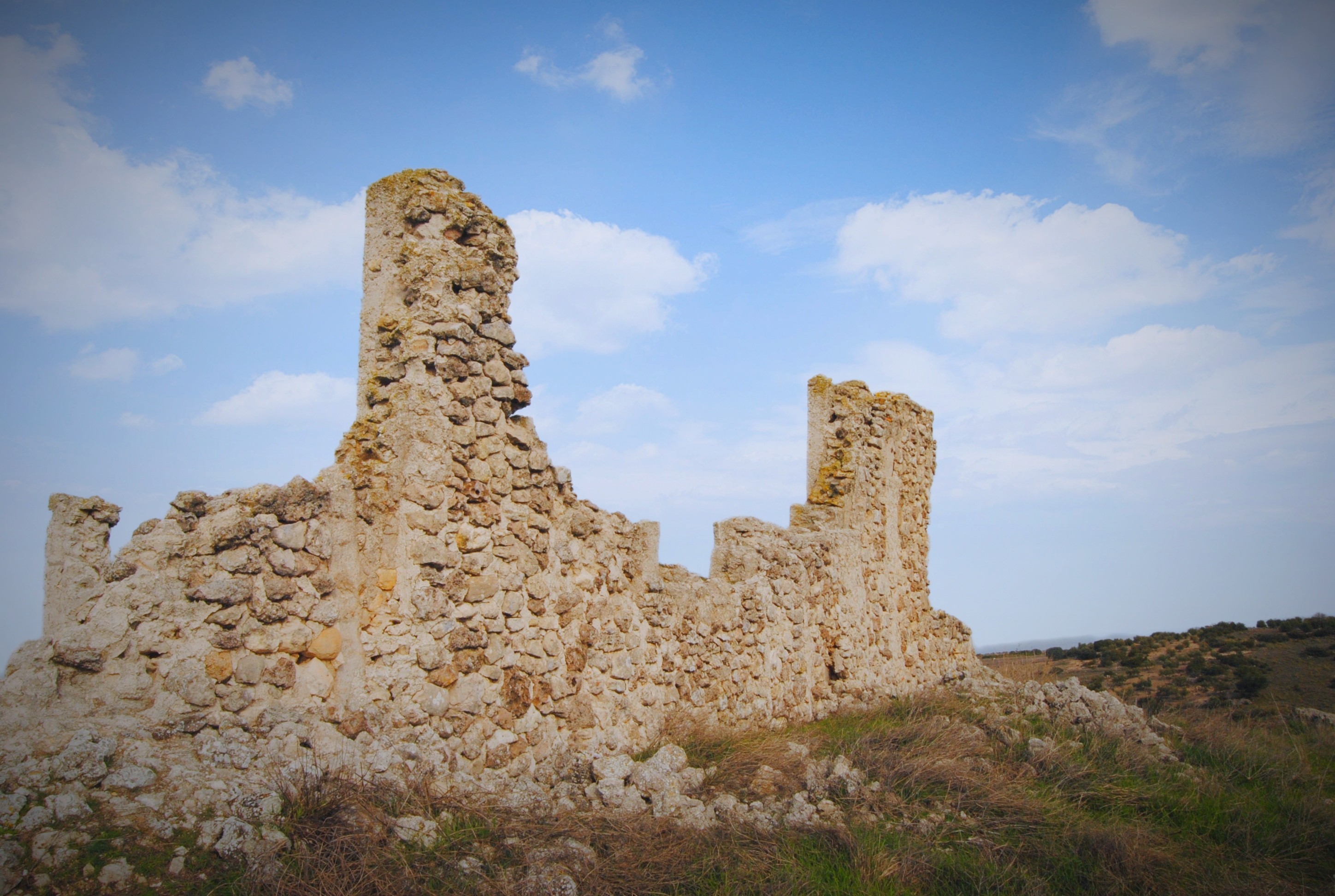 Avanzando entre tierras labradas, las ruinas de una ermita medieval de dos naves separada por dos pilares nos permiten imaginar el esplendor que viviera la zona en la Alta Edad Media. La iglesia de Santa María se alza sobre la cima de este monte que despunta entre los valles más fértiles de la zona, próxima al nacimiento del arroyo de San Pedro.